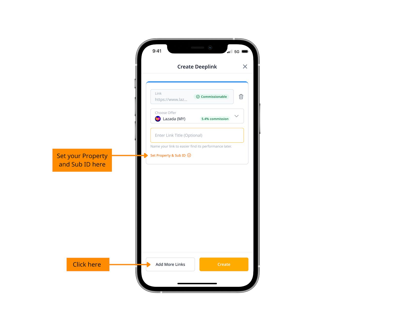 If you have multiple properties or Sub IDs, tap “Set Property & Sub ID” to assign the correct one before generating your link.