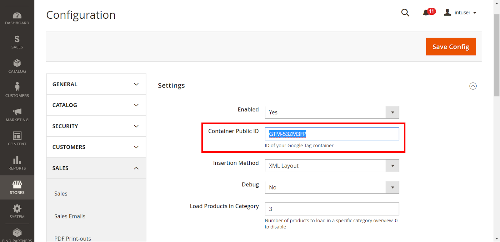 10. With your GTM ID in hand, go back to your website's Magento admin dashboard. Paste the ID into the Container Public ID field and save your changes.