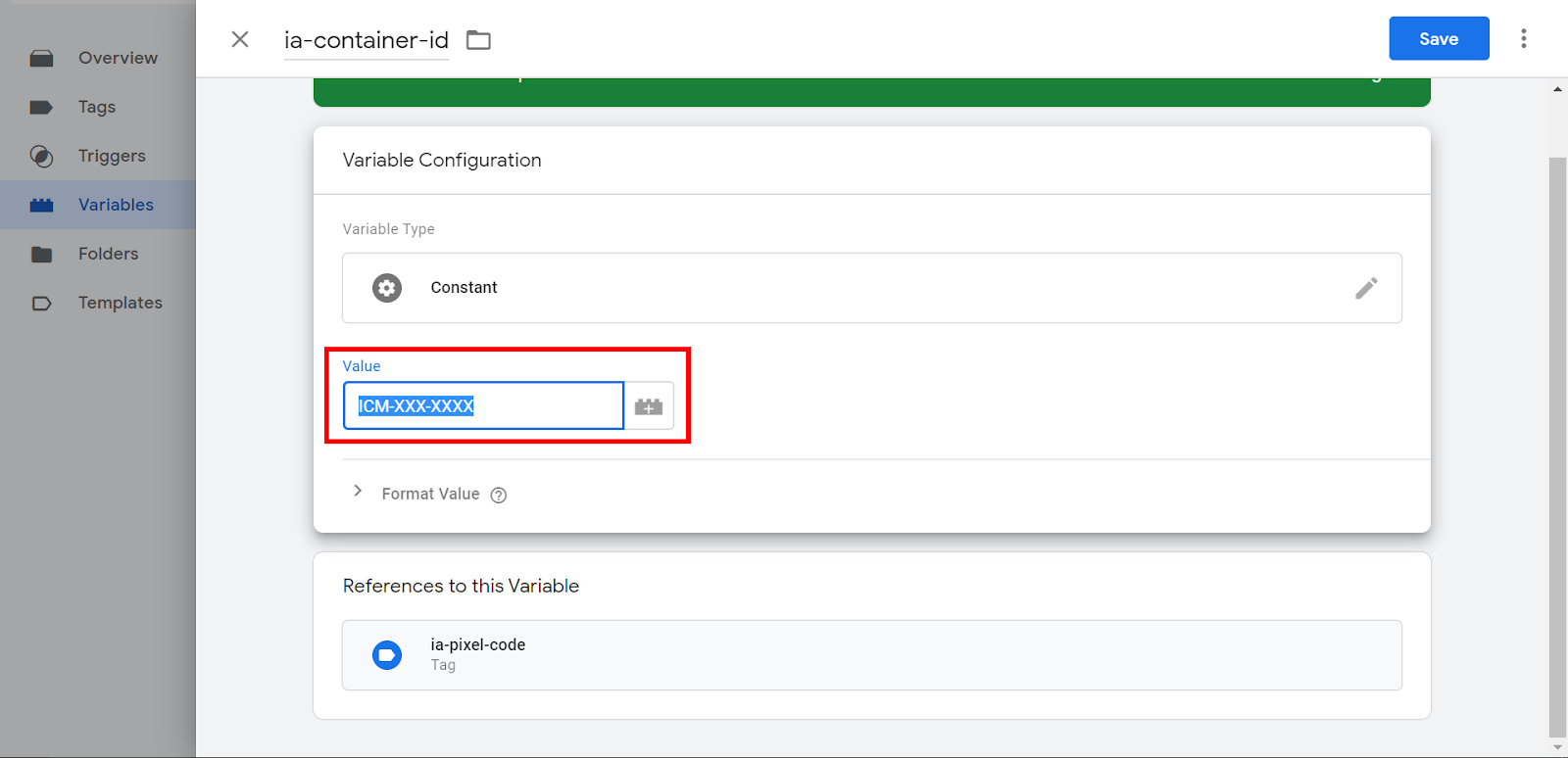 16. Change the placeholder value to your container ID. You must change it to match your container ID for the scripts to work correctly. To get your container ID, contact your account manager, or send an email to the integration team. When you're done, save your changes.