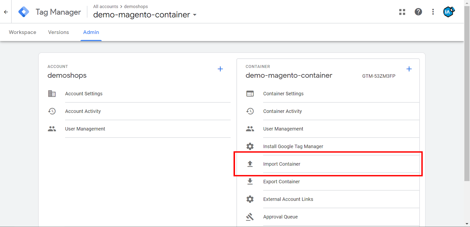 9. Copy the GTM ID of the container(e.g. GTM-XXXXXX) from the top-right of the page. Note that the GTM ID shown in the screenshot below is an example and you must use your own GTM ID.