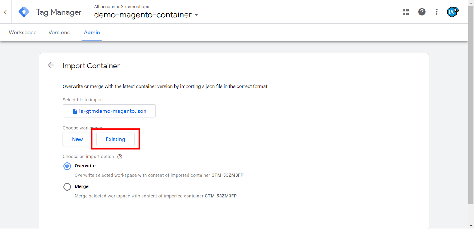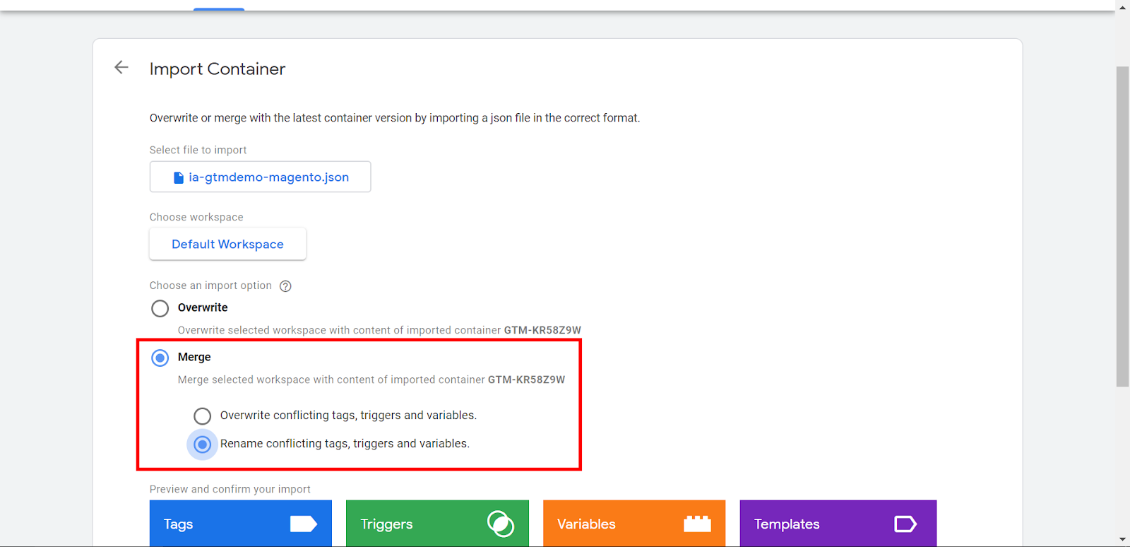 9. Under Choose an Import Option, select the Merge option, then choose to rename conflicting tags, triggers, and variables.