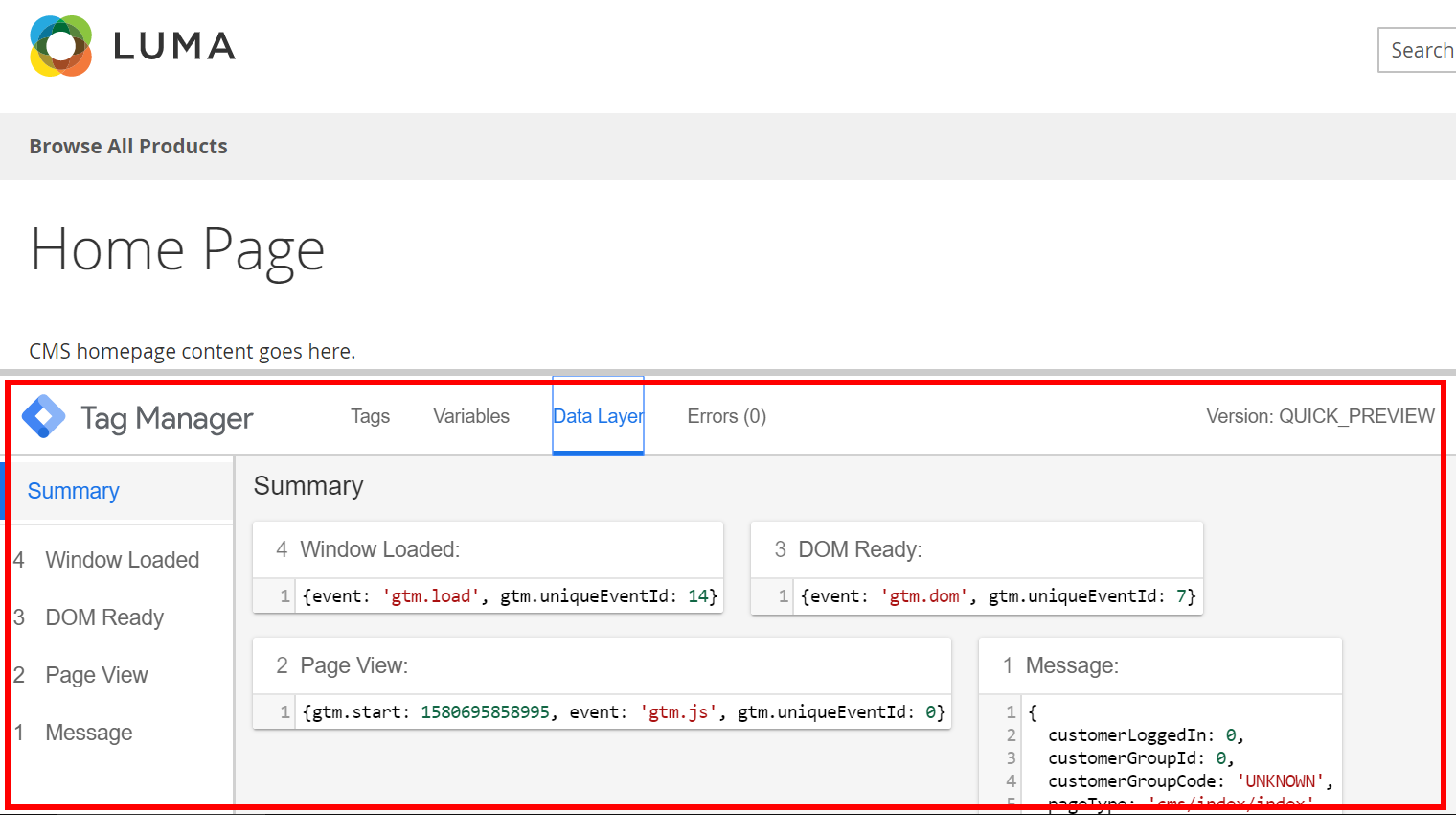 6. You should see the GTM debug panel at the bottom of the page. Click on the Data Layer tab to view data layer values on the current page.