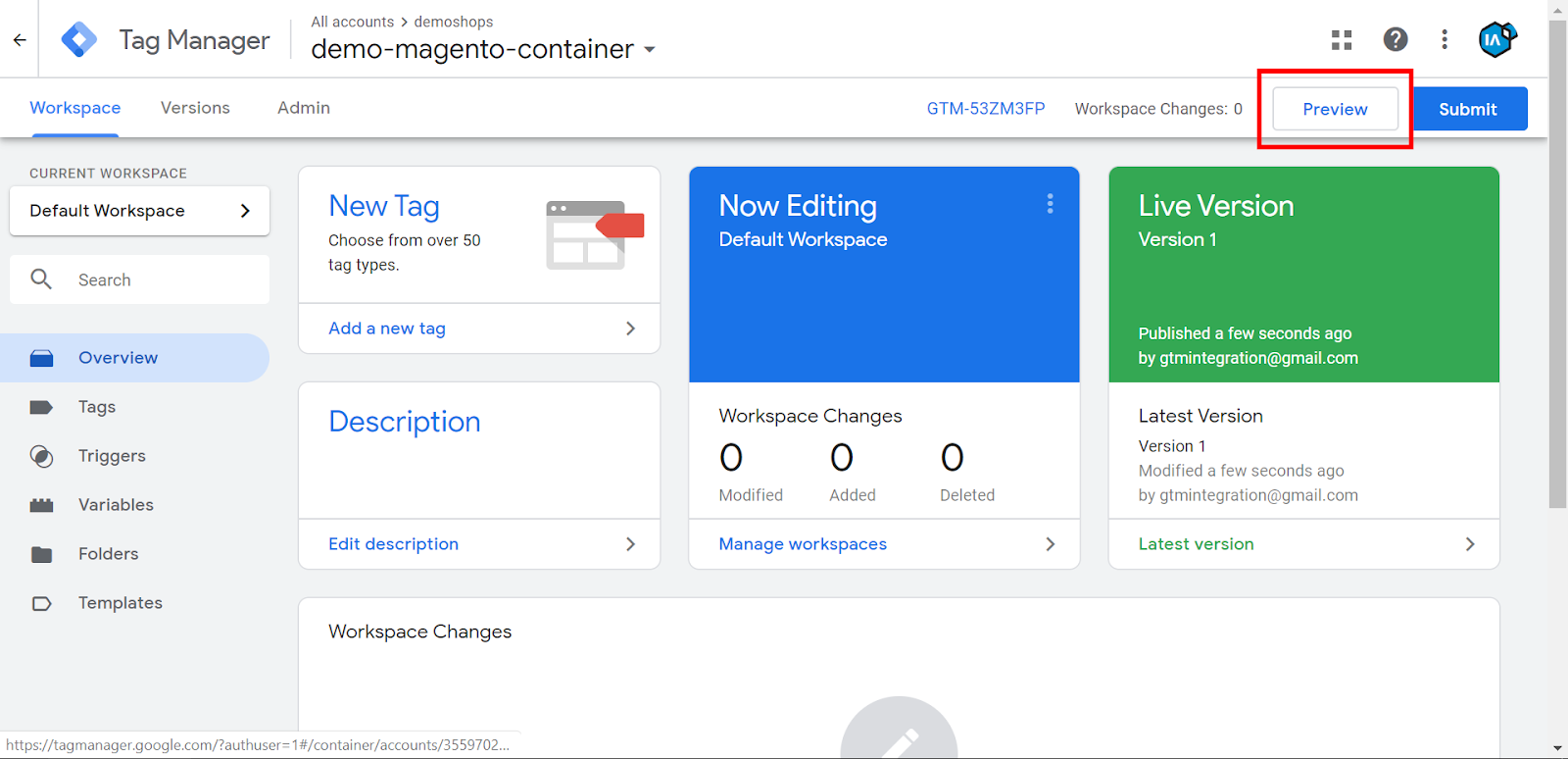 2. Click on the preview button to enable GTM preview mode in your browser.