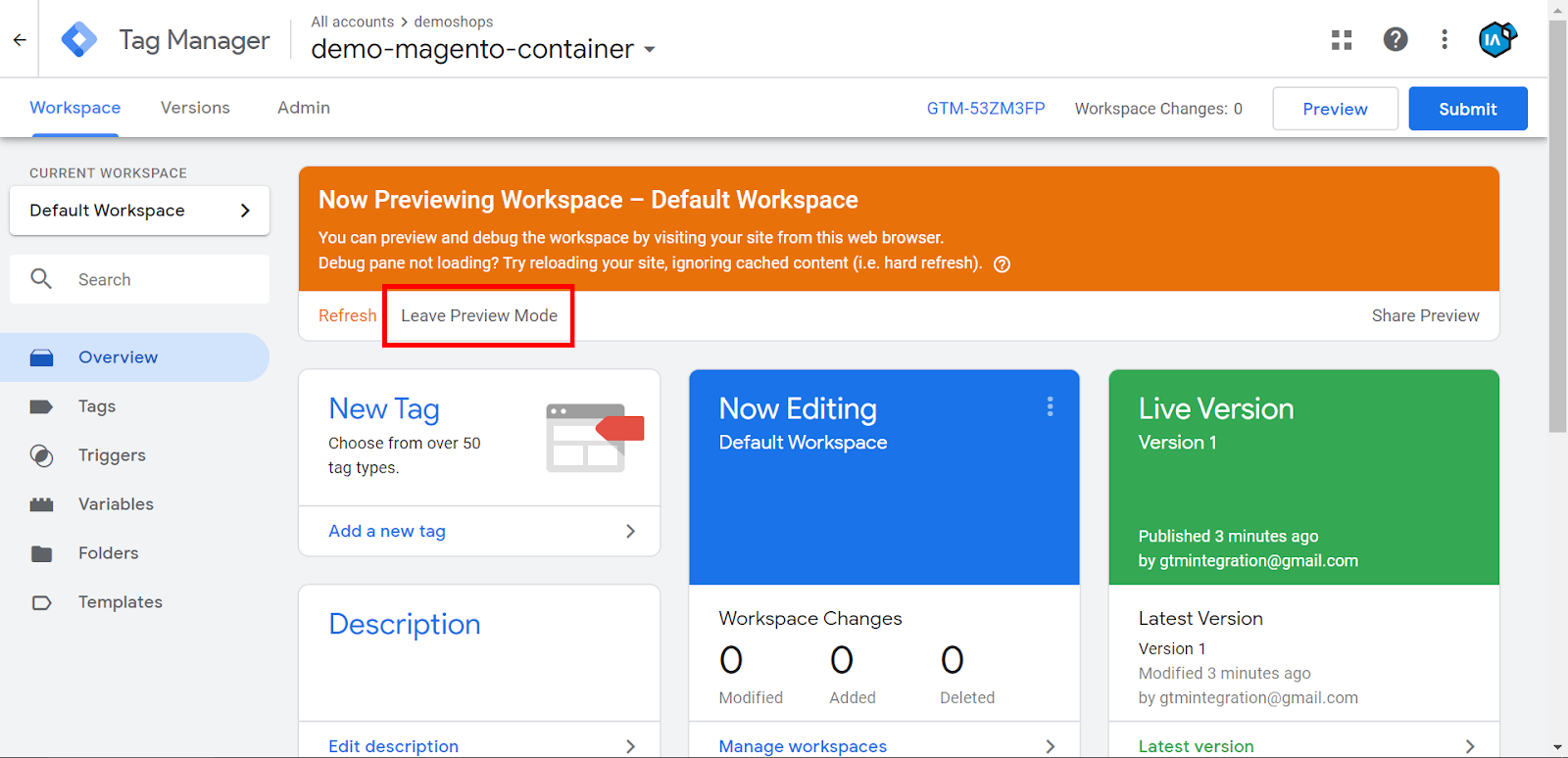 11. When you’re done with the above steps, click on "Leave preview mode" in Google Tag Manager to remove the GTM panel.