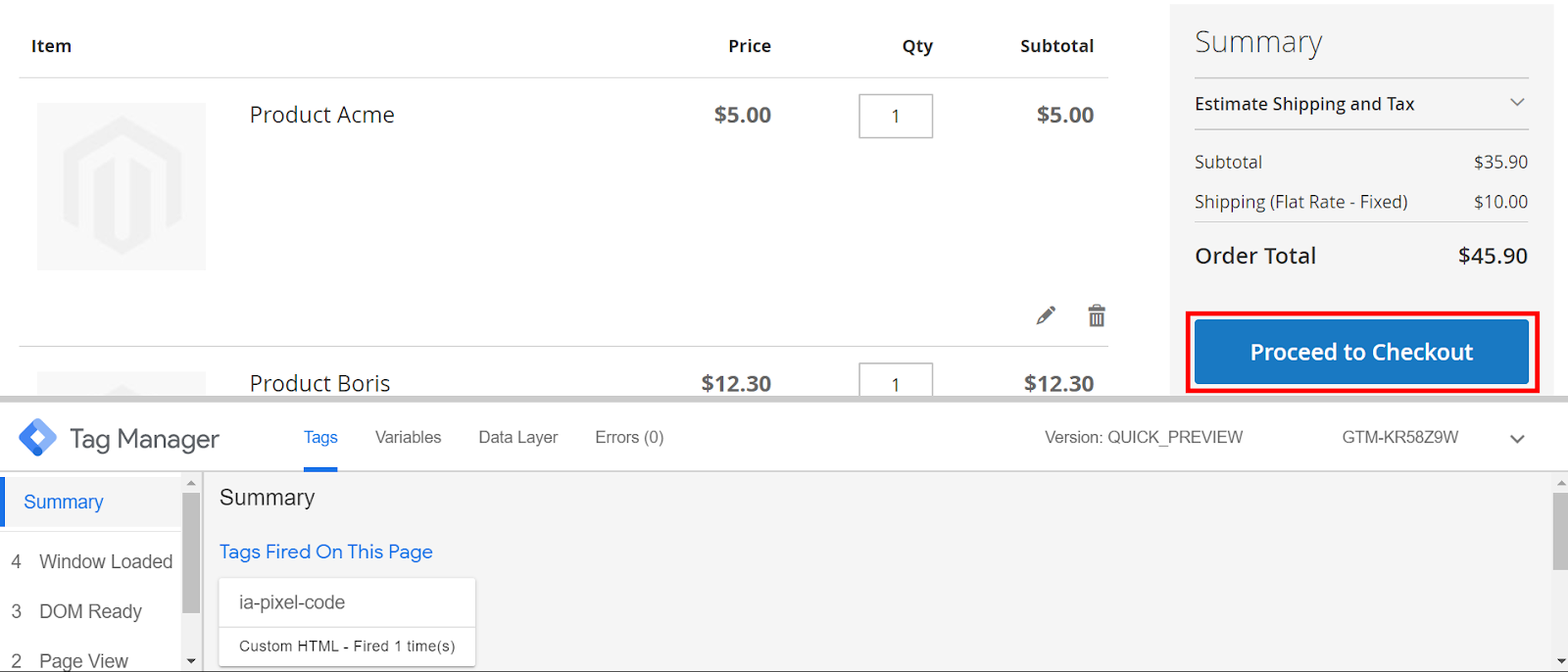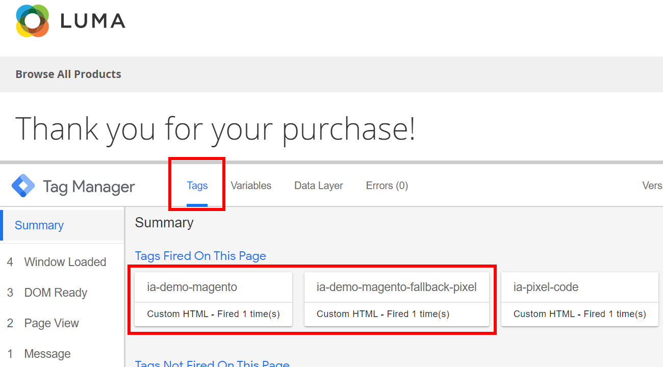 10. At the same page, check the Tags tab to make sure that the conversion tags added from the previous section of this guide are fired. You should see ia-demo-magento and ia-demo-magento-fallback-pixel under “Tags Fired on This Page”.