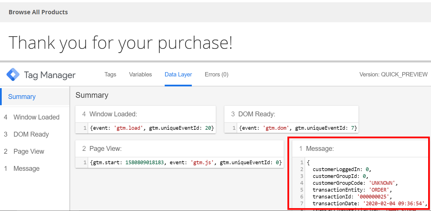 9. Check if all relevant details e.g. product name, product SKU, price etc are reflected in the data layer on the page. Note that the product information shown here is for illustration purposes only. Your GTM debug panel will show details that match the corresponding order from your website. As the test tags are designed for this guide, it may not capture all product information from your website.