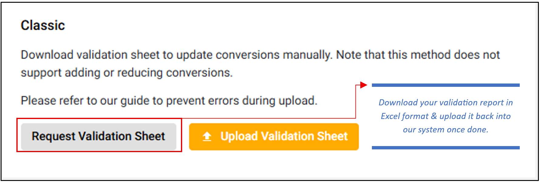 Download the conversions for Excel validation and upload them back later.
